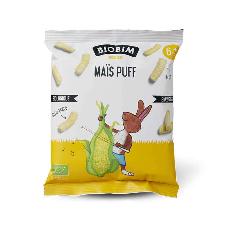 De Mais Puffs van Biobim zijn in de oven gebakken en neutraal van smaak (geen zout toegevoegd!) Heerlijk knapperig en zó luchtig dat ze smelten in je mond. Een smaakvol tussendoortje voor jong en oud, geschikt voor kindjes van 6 maanden en ouder.